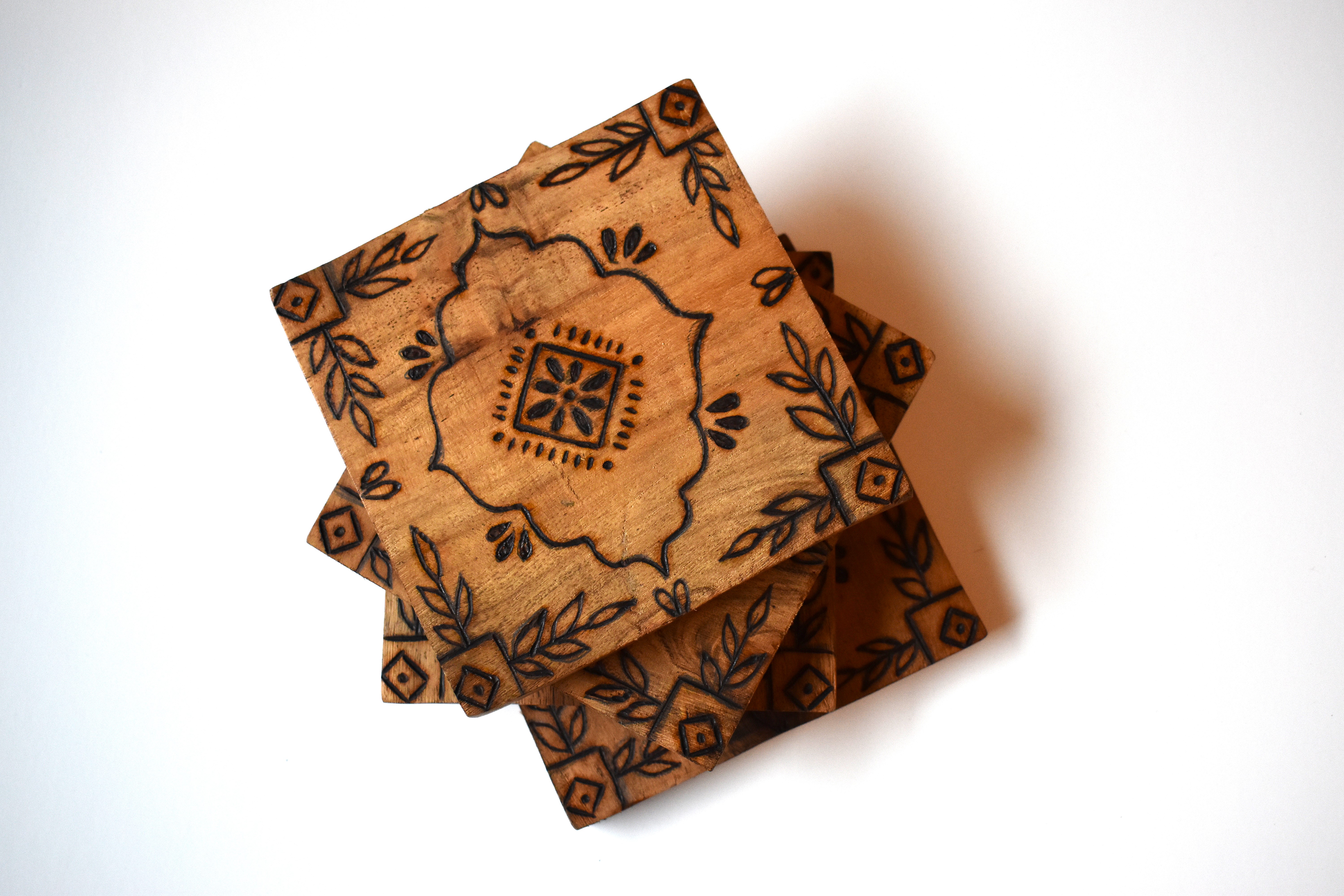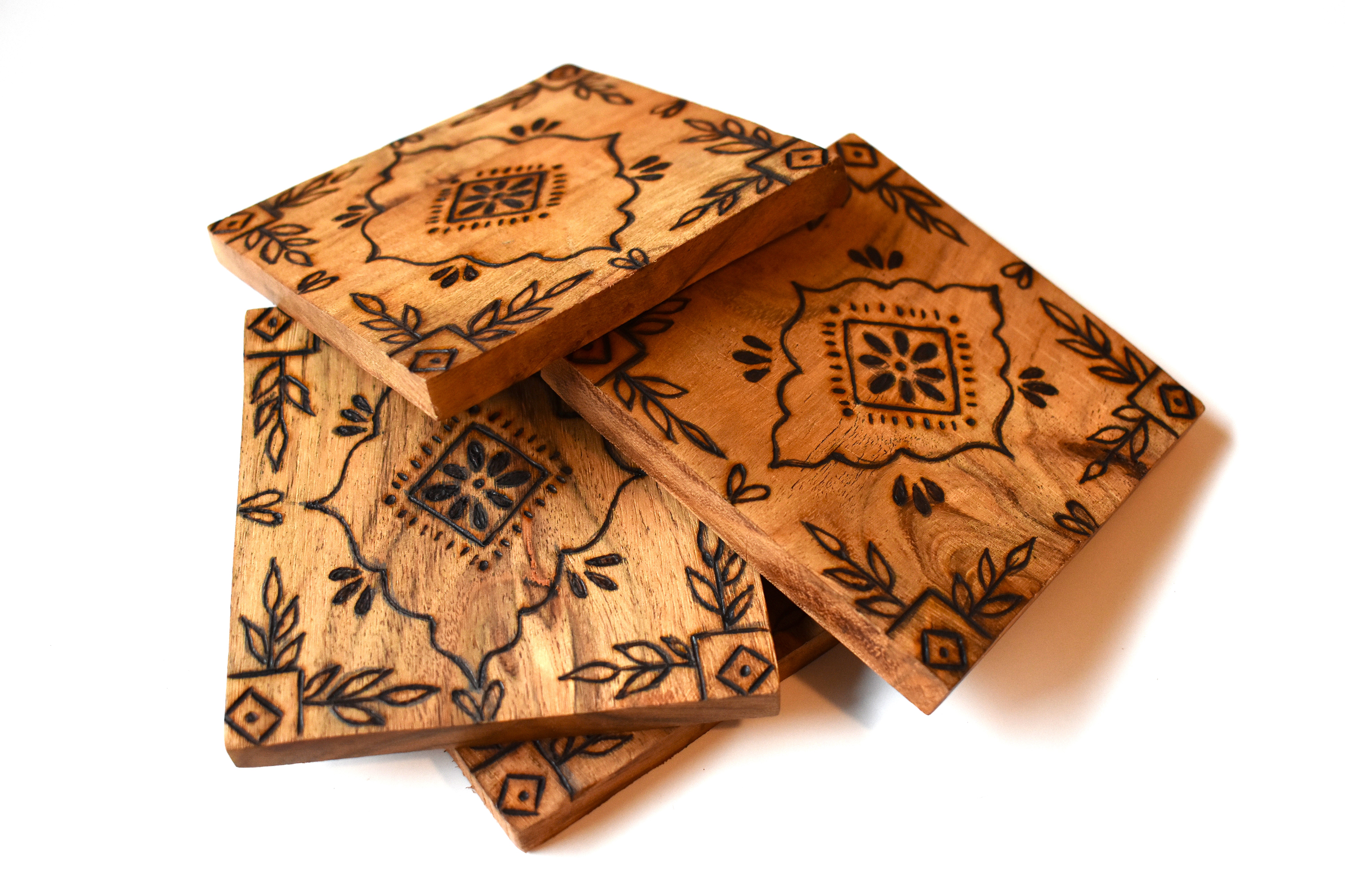Bring a touch of free-spirited artistry to your space with this set of four woodburned coasters, each featuring a unique, hand-drawn henna-inspired pattern. With their intricate lines and organic flow, these coasters add a warm, boho vibe to any table setting—perfect for the mindful host or the art-loving soul.