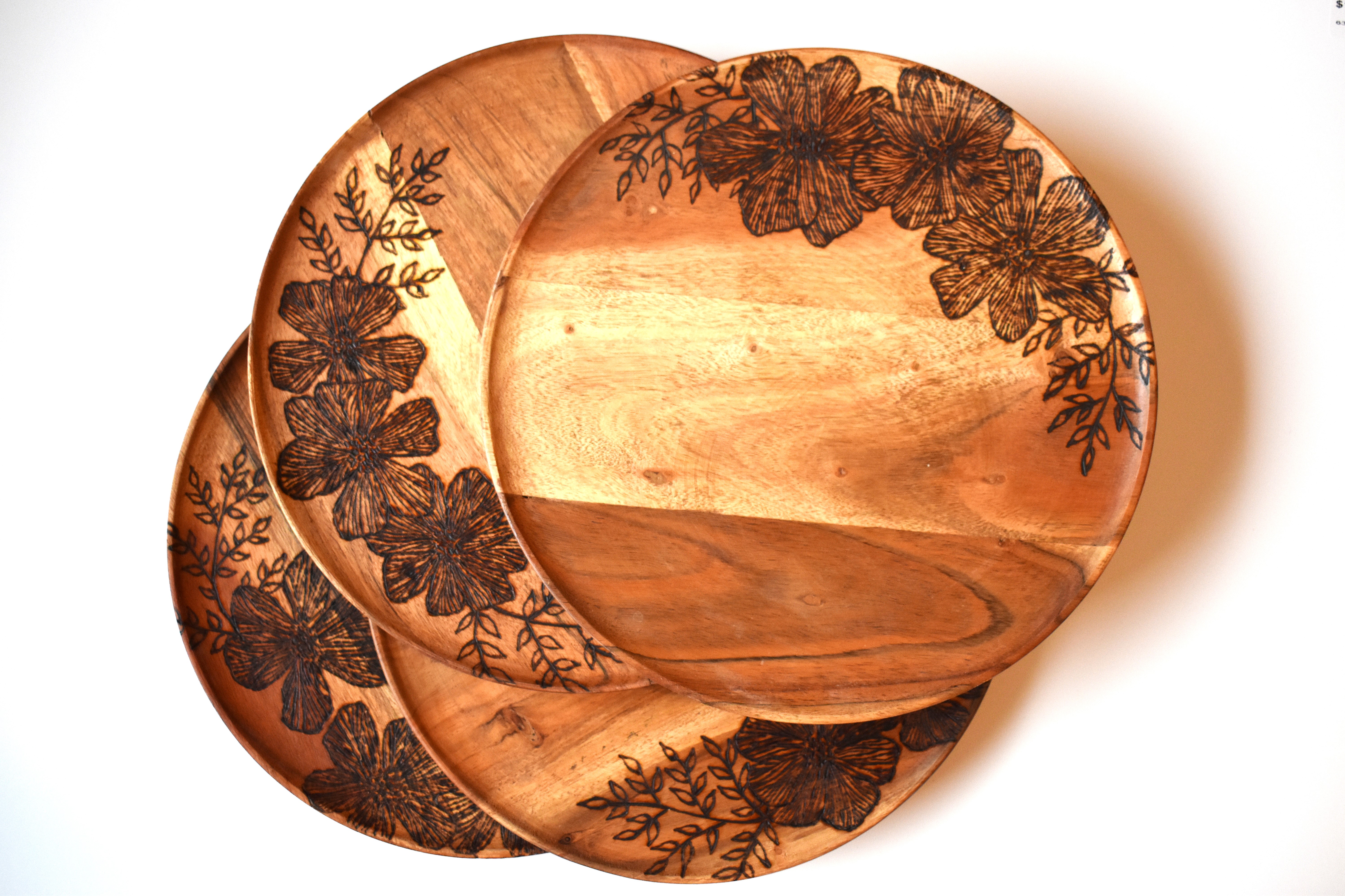 Make every gathering unforgettable with this stunning set of four woodburned charger plates. Each piece is adorned with intricate floral and leaf designs, bringing a natural elegance and timeless warmth to your table. Whether for a cozy family dinner or a lively celebration with friends, these chargers are the perfect blend of artistry and function—sure…
